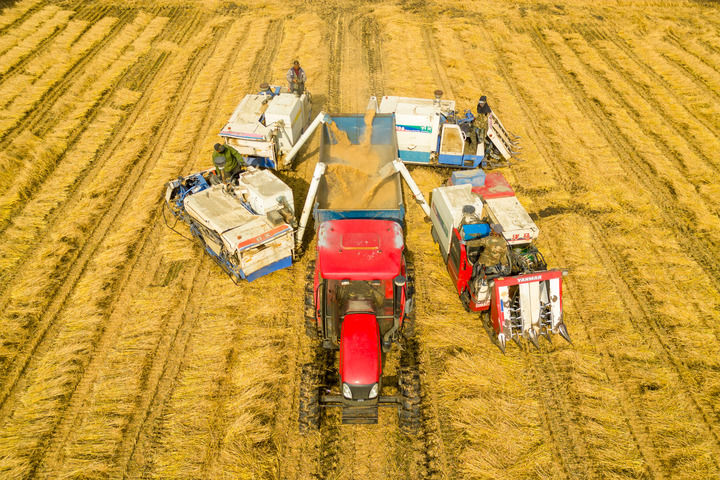2024年10月13日,在黑龙江省绥化市北林区双河镇稻香村,村民驾驶农机进行卸粮作业(无人机照片)。记者 张涛 摄