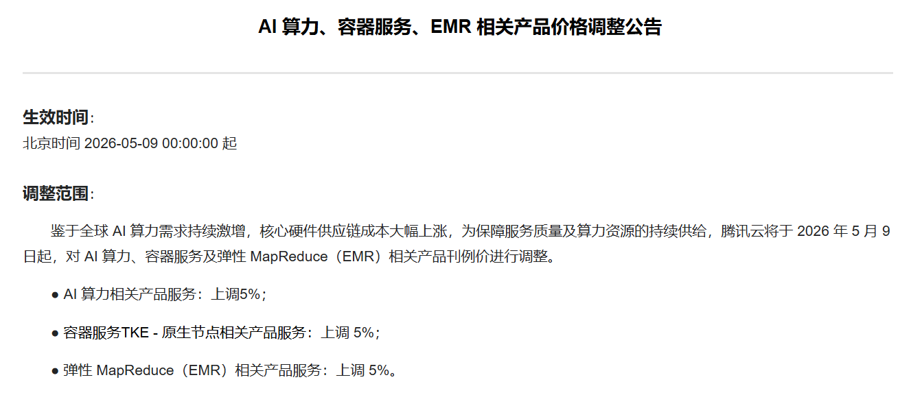 供应链涨价推高云计算价格!腾讯云宣布AI算力等产品涨价5%