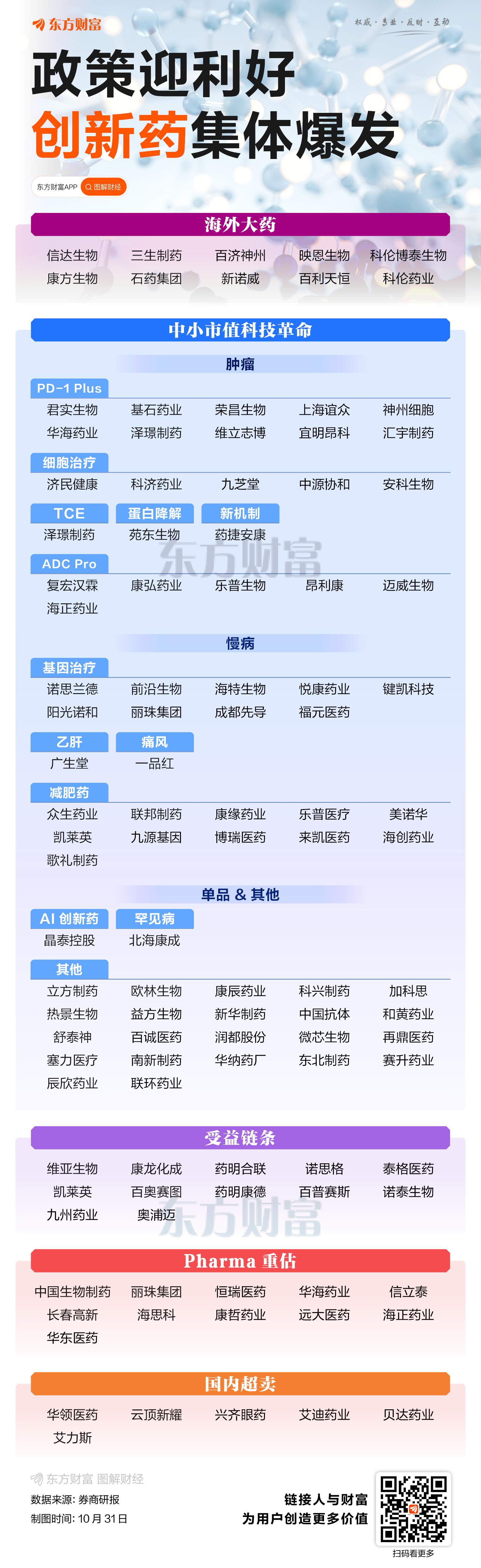 有券商研报表示,创新药的操作思路还是以海外大药(百济神州、科伦博泰生物、石药集团等)、中小市值科技革命(荣昌生物、君实生物、众生药业、广生堂、一品红等)为主。此外,相关受益链条(药明康德、凯莱英、康龙化成等)、Pharma重估(中国生物制药、长春高新等)、国内超卖(华领医药、云顶新耀等)也值得关注。