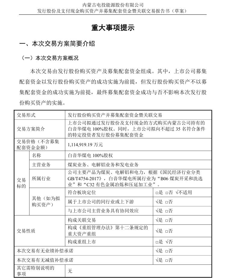 根据草案,电投能源将以发行股份+支付现金相结合的方式购买白音华煤电100%股权,交易总价确定为111.49亿元。
