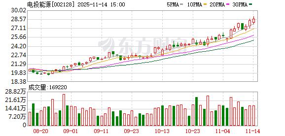 近期电投能源股价不断突破历史高点,11月14日该股盘中上触28.98元,再次创下历史新高,市值为641.76亿元。今年以来,该股节节走高,累计涨幅为52.45%。