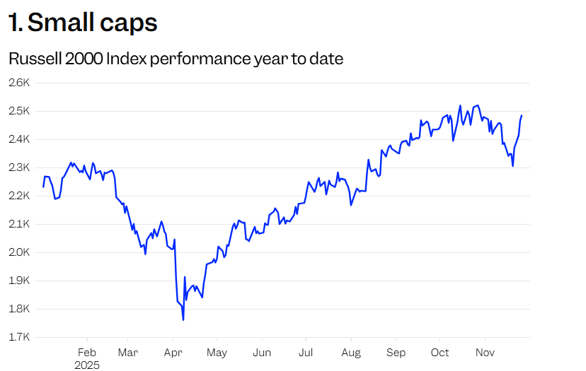 但是,他更看好那些AI以外的板块——这些板块虽然在今年大部分时间里不太受关注,但目前这些板块的股价走势似乎已经开始上涨。他特别指出了三个可能存在良好投资机会的领域,分别是小型股、医疗保健股和海外股票。