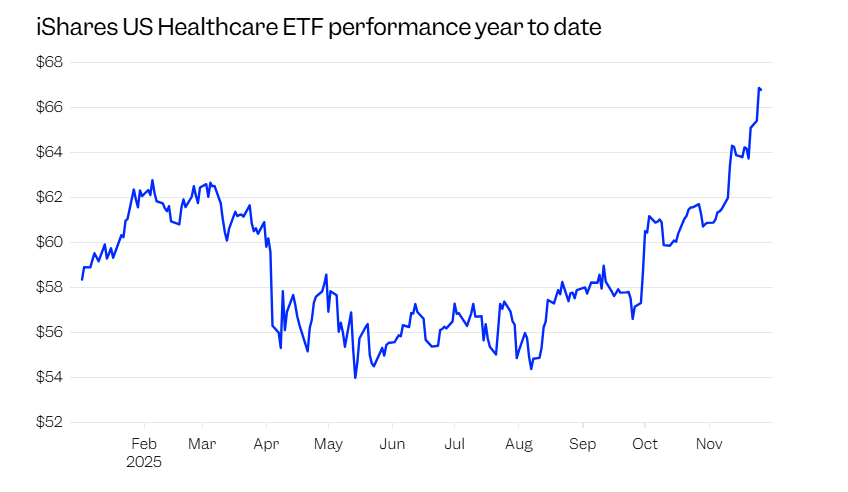 卡伦诺表示,医疗保健这一市场细分领域似乎在一定程度上得益于人工智能的热潮而受益,而该板块的涨势目前已经开始向整个行业蔓延,比如iShares美国医疗保健交易所交易基金今年迄今已上涨14.5%。