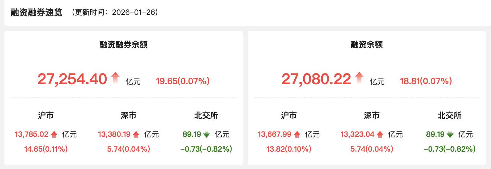 上证报中国证券网讯1月26日,A股两融余额为27254.40亿元,较上一交易日增加19.65亿元,占A股流通市值比例为2.62%。当日两融交易额为3114.07亿元,较上一交易日增加79.37亿元,占A股成交额的9.48%。