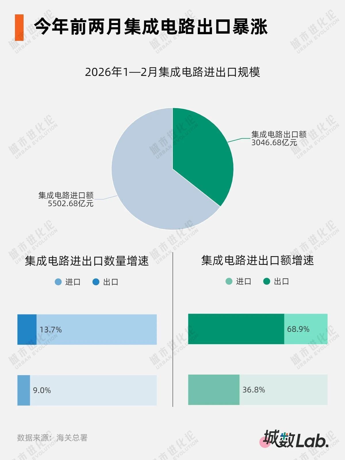 重庆表现亦可圈可点。1—2月,重庆集成电路出口167亿元、增长154.7%,进口174.7亿元、增长65.8%。同期重庆进出口总额增长38.8%,排名全国第二。