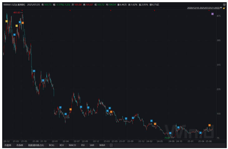 然而,泡沫终有破碎时。当繁华落尽,徒留的是一地狼藉的鸡毛。公司股价从2021年那令人眩目的485.82元历史高点,断崖式跌入百元关口,市值也在惊涛骇浪中从2100亿元的云端滑落至375亿元的谷底,蒸发近1700亿元。昔日的千亿巨头,如今在资本市场已然门前冷落鞍马稀。